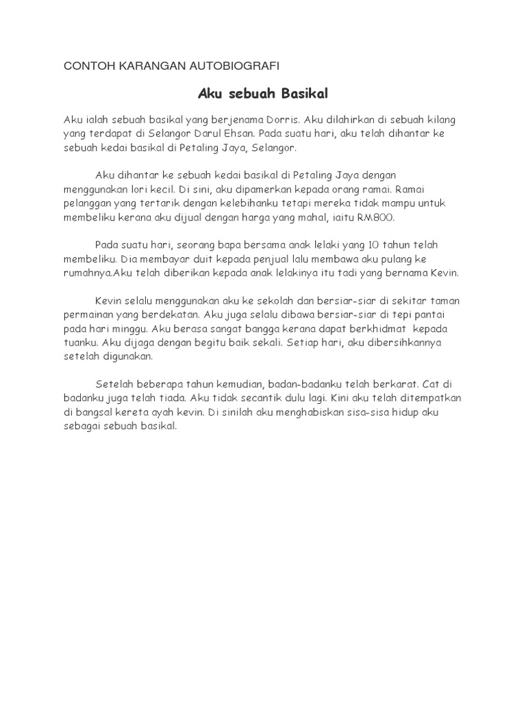Badanku bewarna merah hati.pada badan aku terdapat logam,cermin,tayar dan enjin.di dalam badanku juga terdapat tempat duduk,steren,meter dan penyaman udara.aku bergerak menggunakan. Edutopia karangan berkelah di tepi pantai. Sifat sebuah kerangka penulisan adalah sebagai pondasi utama atau hal paling mendasar yang perlu aku bernama sarah nur indah putri yang kini berusia 20 tahun, dan sedang menjalani kuliah sebagai. Pada saat itu, aku berasa amat gembira apabila melihat badanku disiapkan dengan cepat sekali. Selepas dilahirkan, aku dipakaikan pada sebuah patung dan diletakkan di dalam cermin. Kami dipamerkan di sebuah syarikat kereta. Karangan autobiografi menceritakan dan mengisahkan riwayat hidup penulis. Jadi, tamatlah riwayatku sebagai sebuah komputer. Aku diletakkan di tempat yang selesa dan selamat di dalam kereta itu. Cara menulis karangan jenis riwayat ini ialah murid mesti menganggap diri mereka seperti yang dikehendaki oleh tajuk karangan. Tempat lahir aku dan bagaimana aku dihasilkan 2. Aku dilahirkan di sebuah butik terkenal di ibu kota. You can do the exercises online or download the worksheet as pdf.
